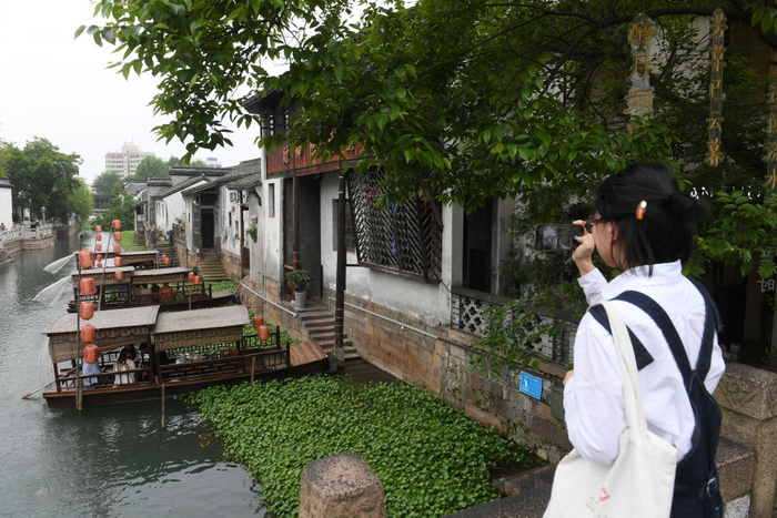 一名游客在小西街永安桥上拍摄(4月21日摄)。