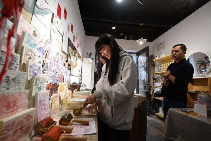 游客在小西街一家店铺体验店主自主设计的滚轮拓印(4月21日摄)。