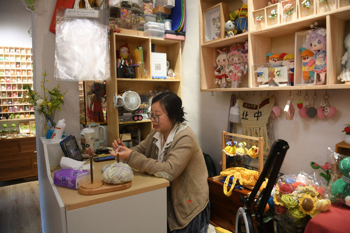 手作爱好者王月芳在设在小西街的工作室做编织(4月21日摄)。