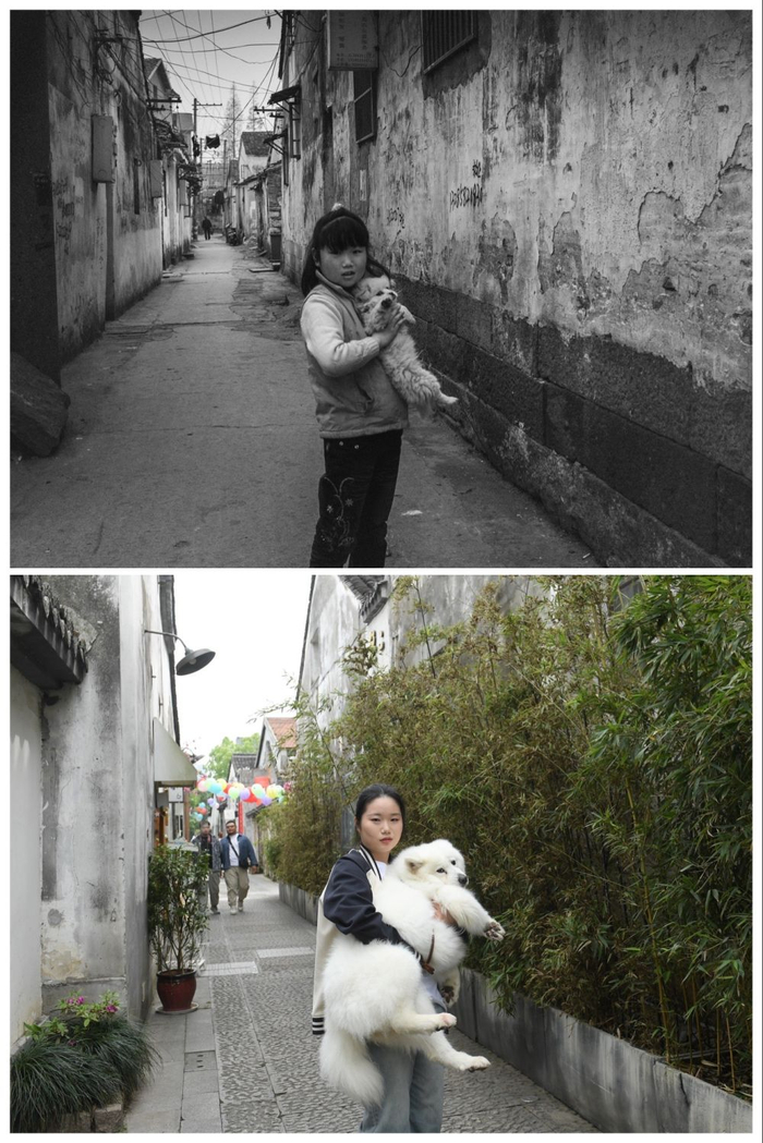 上图为2008年,6岁的陈萍抱着宠物狗“波斯”站在小西街的家门口(肖二摄);下图为2024年4月21日,22岁的陈萍抱着现在的宠物狗“球球”在改成素食店的老家门口留影。