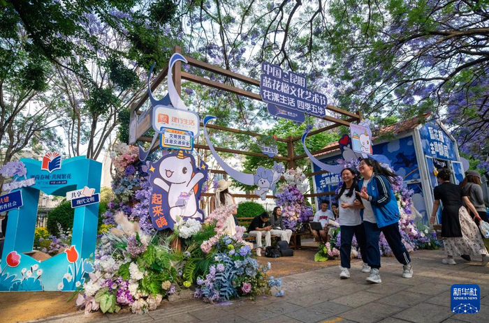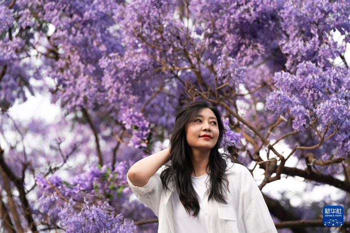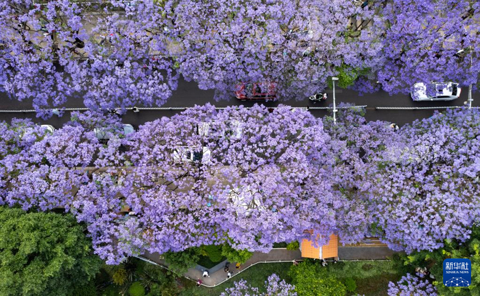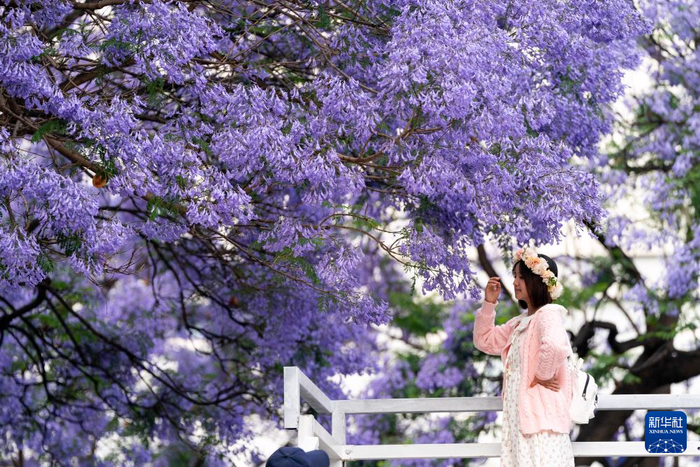 近日,云南昆明的蓝花楹竞相绽放,迎来最佳观赏期。盛放的花朵将大街小巷装点成花海,吸引游客纷纷前来观赏打卡。