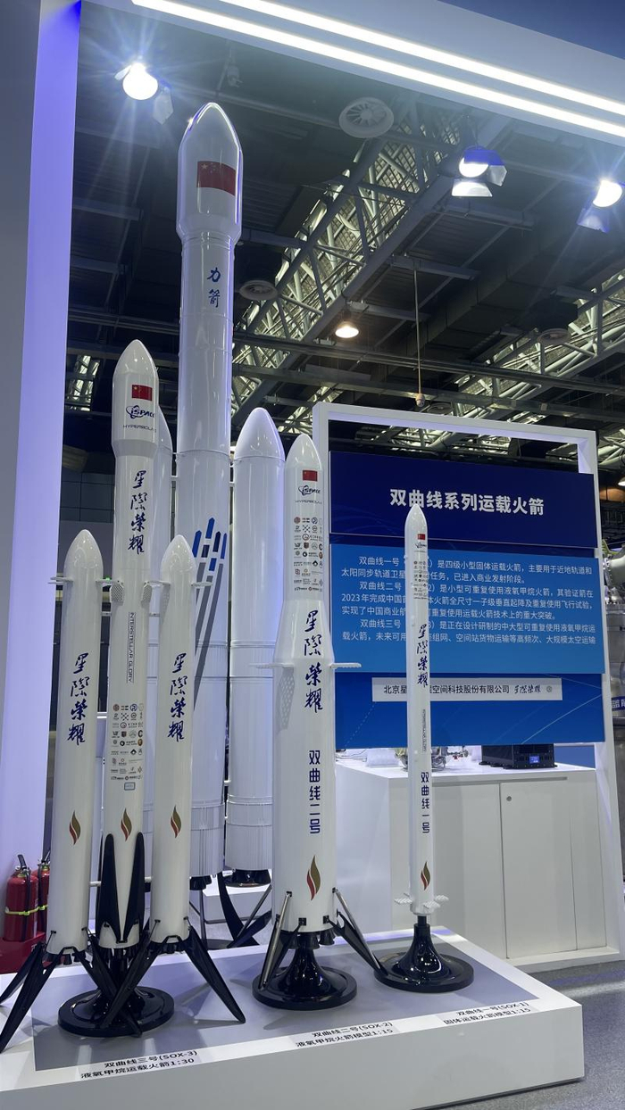 展台上的双曲线三号运载火箭(SQX-3)是一款可重复使用的液体运载火箭。星际荣耀的相关负责人介绍说,针对未来星座组网、空间站货物运输等高频次、大规模太空运输需求。该火箭通过牵制释放、一子级回收多次重复使用,全箭级故障诊断及健康监测、在线重构等技术途径实现高可靠、低成本、批量大、大运力和快速发射。