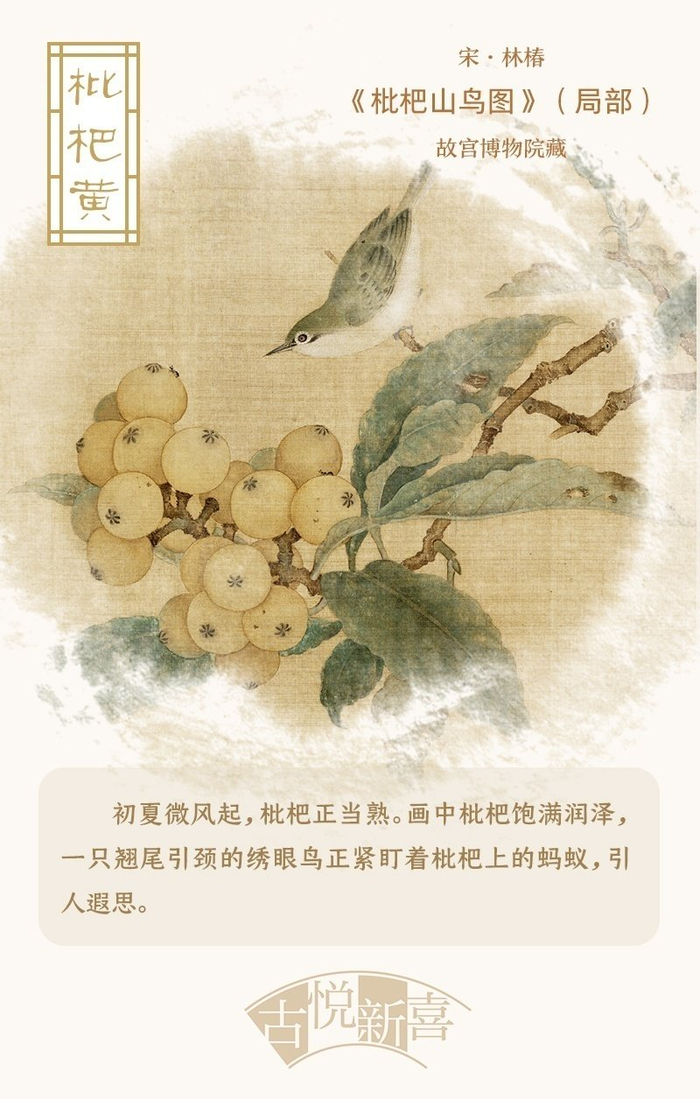 与梅子同为立夏时令水果的还有枇杷,其果实橙黄圆润,寓意吉祥,备受人们喜爱。枇杷与鸟雀的组合,也成为宋代工笔花鸟画的重要图式之一。在继承五代徐熙、黄筌成熟的写生经验基础上,两宋画家直面自然、心摹手追,使“笔工而意写”的工笔花鸟画盛极一时。其主要技法为先勾后染,工整细致;同时,与当时的文人墨戏之法相融,形成萧散古雅、重视笔墨意趣的独特风格。另一种值得注意的技法为“没骨画法”,此法或工或写,均不用墨线勾勒物象轮廓,而直接通过墨与色的挥写或晕染塑造物象,注重笔痕墨韵和敷彩设色的有机融合。在构图方面,宋代花鸟小品多为“折枝画”——画家以审美的眼光从“触目横斜千万朵”的繁茂花丛中,删繁就简折取赏心悦目的“三两枝”入画,以特写式手法描绘花木的细节之美。“折枝”,也逐渐演变为一种取景构图的方式,以小观大,以少胜多。