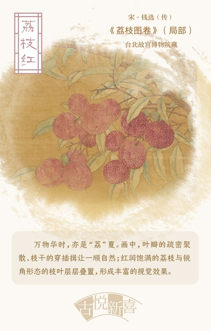 万物华时,亦是“荔”夏。五月,早熟的荔枝已经上市,宋末元初画家钱选(传)《荔枝图卷》便展现了此时累累荔枝成熟可人的景象。画中,叶瓣的疏密聚散、枝干的穿插揖让一顺自然;红润饱满的荔枝与锐角形态的枝叶层层叠置,形成丰富的视觉效果;5只小鸟分栖于密林间,或相呼相望,或隐身叶后,或回首观蝶,或独自鸣唱,整幅画卷恰如一首轻快的协奏曲,让鸟语果香环绕观者周围,展现了画家平淡天真的审美趣味。