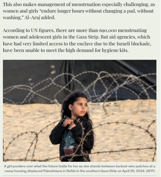 △“阿拉伯新闻”网站报道援引联合国的数据报道称,加沙地带有超过69万处于经期的妇女和少女。但以色列的封锁,使得援助机构进入这里的机会非常有限,无法满足对卫生用品的高需求。
