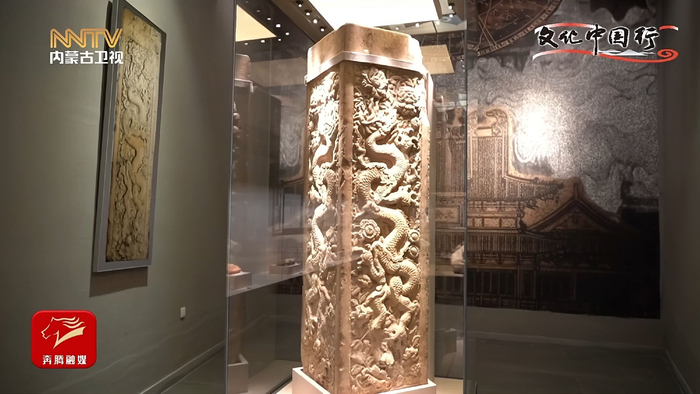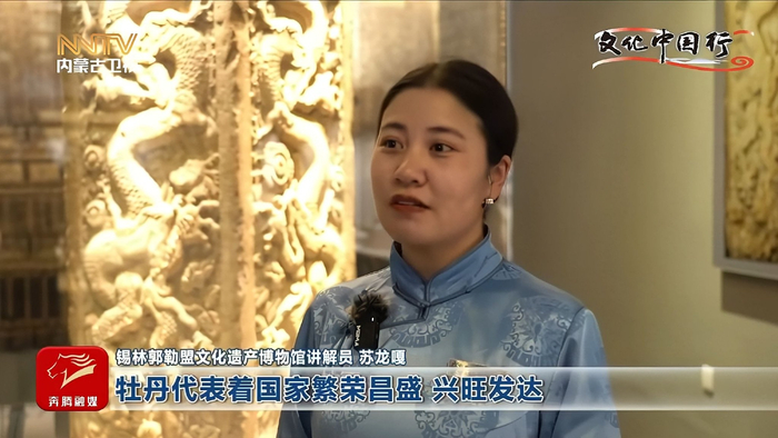 锡林郭勒盟文化遗产博物馆讲解员 苏龙嘎 牡丹代表着国家繁荣昌盛、兴旺发达,菊花和荷花代表着长久和长寿,整幅浮雕有着浓郁的中原文化特色,也是草原文化和农耕文化融合的实物见证,更是共同缔造中华多元一体的历史见证。