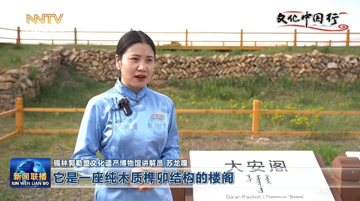锡林郭勒盟文化遗产博物馆讲解员 苏龙嘎 它是一座纯木质榫卯结构的楼阁,殿阁面阔9间、进深5间,寓意为“九五至尊”,外观4层、暗含3层共7层的高阁建筑。它曾经耸立百年之久,见证并承载了上都城内发生的一系列重大的事情,是上都城内的象征。