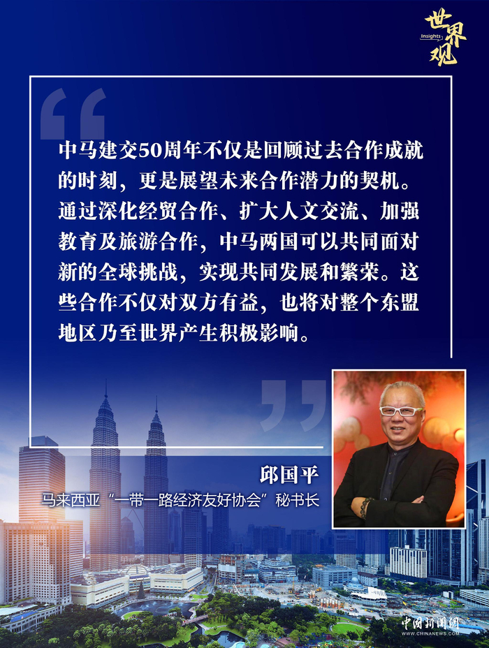 抚今追昔,鉴往知来,站在携手走过半个世纪的历史节点上,邱国平说,“其实中马建交50周年不仅是回顾过去合作成就的时刻,更是展望未来合作潜力的契机。通过深化经贸合作、扩大人文交流、加强教育合作及旅游合作,中马两国可以共同面对新的全球挑战,实现共同发展和繁荣。这些合作不仅有益于中马两国,也将对整个东盟地区乃至世界产生积极影响。”