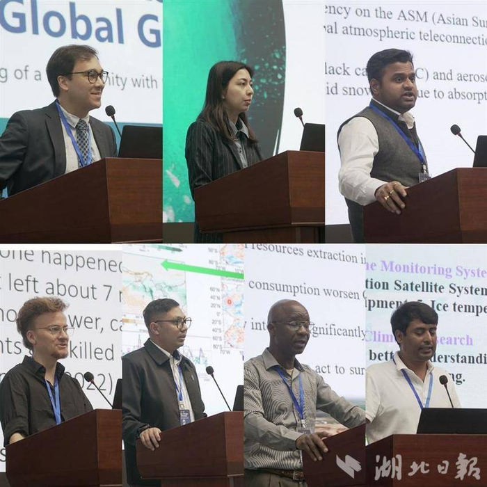在报告环节,复旦大学冰岛籍博士生FRANCESCA RAN ROSITUDOTTIR及巴西籍博士生PEDRO STEENHAGEN探讨了极地丝绸之路及其在全球治理中的作用。中国科学院西北生态环境资源研究院印度籍博士后ABHISHEK BANERJEE通过大数据分析和网络遥感技术揭示了全球变暖背景下的喜马拉雅冰冻圈变化及其对人类的长远影响。中国海洋大学美国籍博士生EMERSON DELARME从大气科学角度解释了2022年在北美发生的历史性极寒“炸弹气旋”的影响及其启示。南京信息工程大学缅甸籍博士生KYAW THAN OO介绍了极地气候变异对中南半岛季风产生的影响。华中科技大学马里籍博士生MOHAMED OUEDRAOGO着眼更广义的全球环境治理问题,讨论了非洲经济发展过程中石油和矿产资源对二氧化碳排放的影响。武汉大学巴基斯坦籍博士生SHAH SHOUKAT ALI运用测绘遥感技术,探讨了冰冻圈和气候变化对湖泊产生的影响。