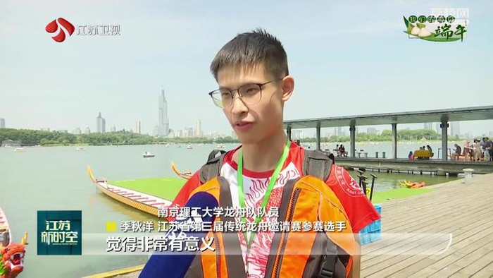 南京理工大学龙舟队队员、江苏省第三届传统龙舟邀请赛参赛选手季秋洋说,赛龙舟是我们的传统,南理工龙舟队来参加这次比赛觉得非常有意义。作为年轻一代,也希望能够传承好端午文化。