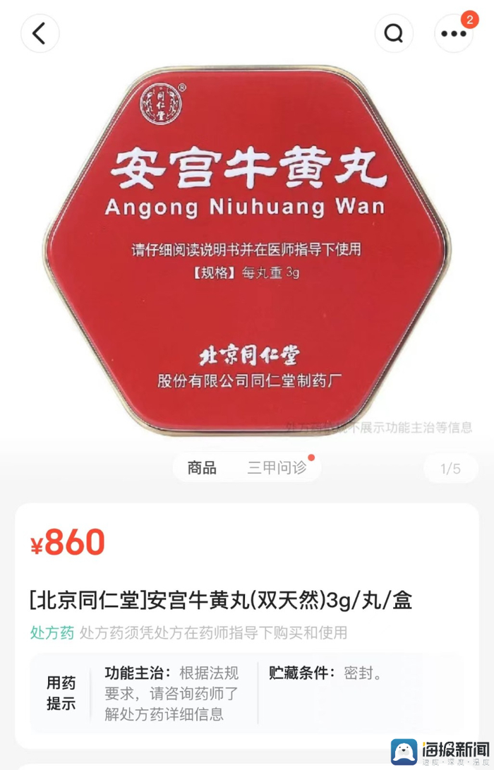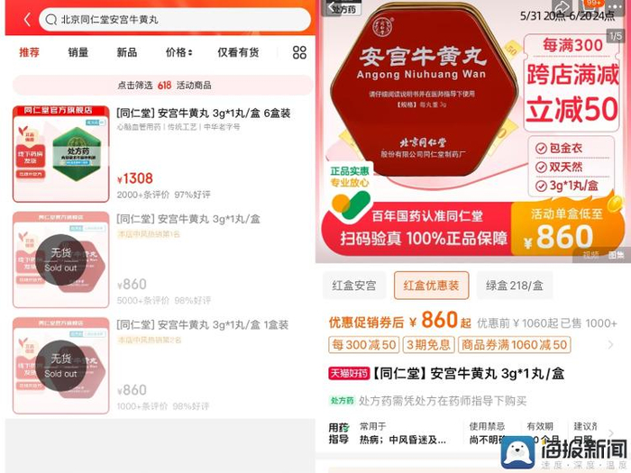 而在淘宝同仁堂药品旗舰店内,安宫牛黄丸仍是860元一粒的零售价售卖,该平台显示已售出一千多份。