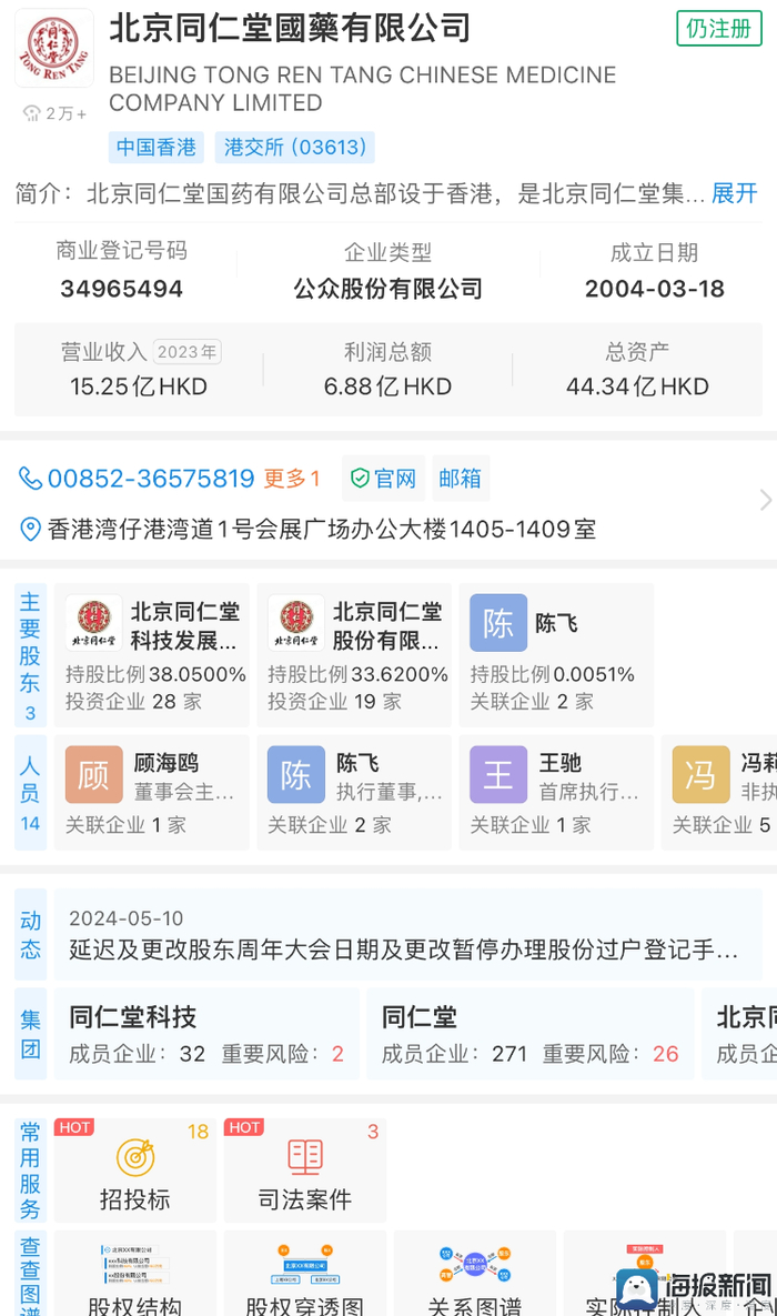 企查查显示,北京同仁堂国药有限公司总部设于香港,是北京同仁堂集团的海外发展平台