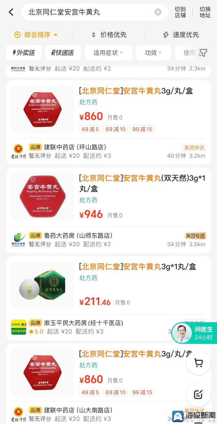 随后,记者在美团等线上平台搜索安宫牛黄丸看到,除了有一些低价补贴的店铺外,大部分济南市实体药店仍保持每粒860元的零售价。同时,也有一些店铺价格高于指导价,记者致电询问后,多位店员表示是平台定价问题,“平台可能会收取一部分费用,我们改不了价格,我们店内是卖860元一粒,您方便的话,可以到店内购买。”
