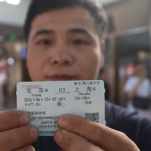6月15日,北京站,旅客展示北京站首发京沪高铁G3次列车车票。 新京报记者 王贵彬 摄