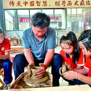 学生在山东临清魏湾镇魏家湾贡砖文化产业园体验陶艺制作。吕盼盼摄/光明图片