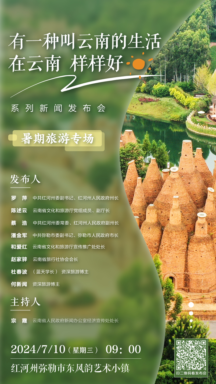 7月10日上午,云南省人民政府新闻办公室在红河哈尼族彝族自治州弥勒市东风韵艺术小镇,召开“‘有一种叫云南的生活’·在云南 样样好”系列新闻发布会·暑期旅游专场,介绍相关情况并回答记者提问。