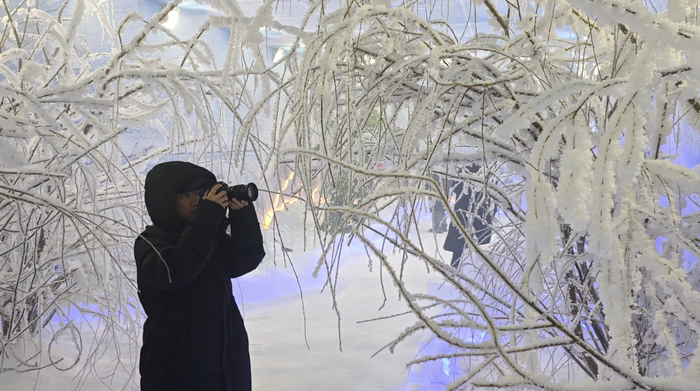 在吉林市北山四季越野滑雪场室内雾凇实验室,江苏游客陈佳佳身着羽绒服,在挂满冰晶的柳树前拍照,仿佛置身寒冬,“太震撼了!弥补了我之前没看到雾凇的遗憾。”