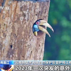 云南铜壁关省级自然保护区管护局工程师 杨祖伟:2023年一次突发的意外,洪崩河区域一巢花冠皱盔犀鸟的天然巢穴被大风拦腰吹断了之后,我们保护区的科研员就及时组织人员去把这个天然巢洞截取下来,测量了它里面的巢洞、巢高这些相关的数据,设计制作了一个人工巢箱。2024年1月下旬左右,就把它挂到了被损坏的巢树边的另外一棵树上。