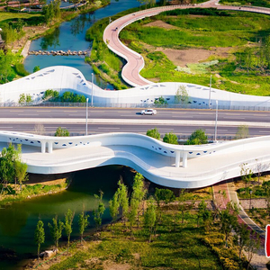 6月15日,蓝天白云下,造型别致的“悦动生命·光影桥”与中央绿谷美景相互映衬,形成了独特的风景。这座桥的桥梁为大跨度单层双向曲面网壳结构,跨度为100米,钢构最宽处约18米。主体桥梁采用人车分离设计,机动车行驶道路部分采用现浇连续箱梁结构,方便快速通车。人行道路部分造型设计艺术化,方便行人驻足欣赏中央绿谷美景。