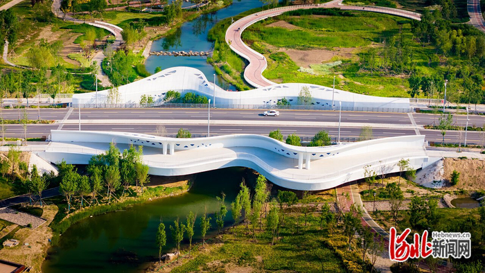 一座城市,因为水而有了灵气;一座有水的城市,因为桥梁而有了诗意。作为雄安新区基础设施建设和运营的主力军、先锋队,雄安集团基础建设有限公司在市政道路建设过程中因地制宜,优化设计,下足“绣花”功夫,坚持“一桥一景”,不断提升道路使用功能和慢行服务品质。图为航拍的“悦动生命·光影桥”。