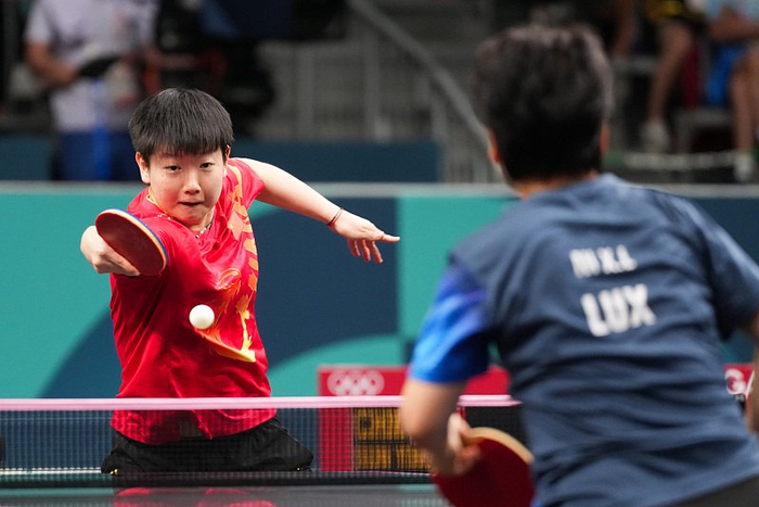 巴黎奥运会上,孙颖莎是唯一身兼女单、女团、混双三项重任的中国女乒主力。在此前进行的混双决赛中,孙颖莎搭档王楚钦以4比2战胜朝鲜组合李正植/金琴英,为中国乒乓球队首夺该项目奥运金牌。女单首轮中,孙颖莎仅用26分钟就以4比0战胜巴西选手高桥·朱丽叶。32强战遇到倪夏莲,谈及这场年龄跨度极大的对决,孙颖莎表示,非常开心可以在奥运赛场与乒坛传奇倪夏莲阿姨交手,因为她身上体现着一种体育精神,有很多值得年轻选手学习的东西。