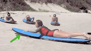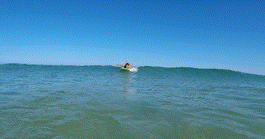 等到浪到来时,划水成功并感觉到冲浪板向前推动并且感觉到速度加快时,我们开始起身,手掌找到你的肋骨,平放于肋骨两侧,撑起身体。