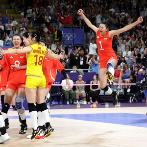 ↑7月29日,中国队球员在在巴黎奥运会排球女子小组赛A组比赛后庆祝,中国队3比2战胜美国队。
