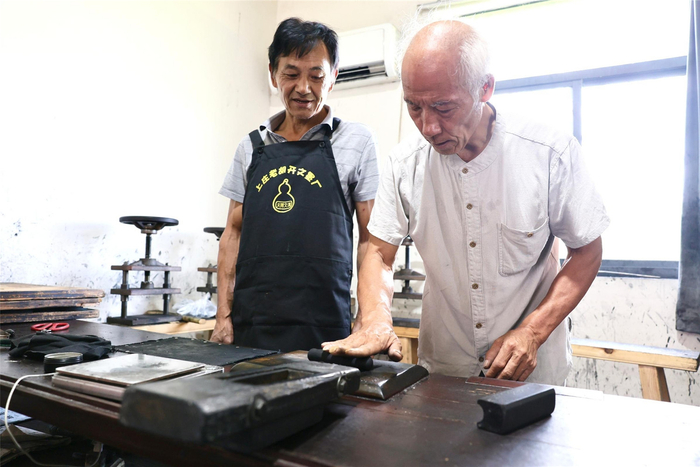 7月23日,在泾县中国宣纸小镇,大国工匠、全国五一劳动奖章获得者毛胜利和省级非物质文化遗产项目宣纸代表性传承人汪息发向游客展示宣纸制作这一承载了徽香墨韵的千年古技。