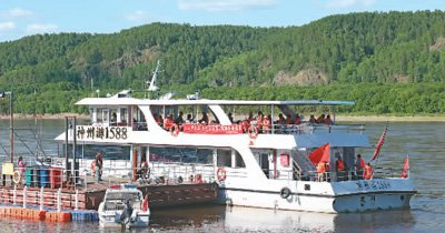 游客乘船在黑龙江上观光、游玩。