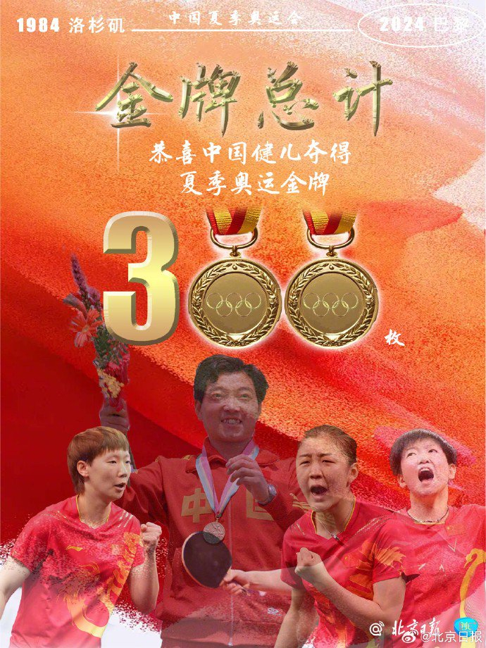 中国乒乓球女团的这枚金牌是中国代表团本届获得的第37枚金牌,加上之前十届取得的263枚金牌,刚好300金。