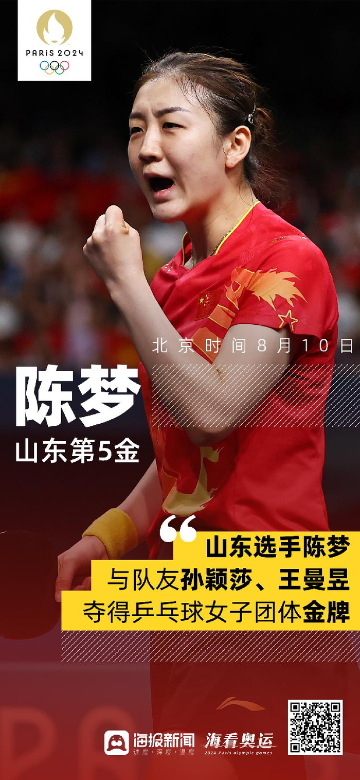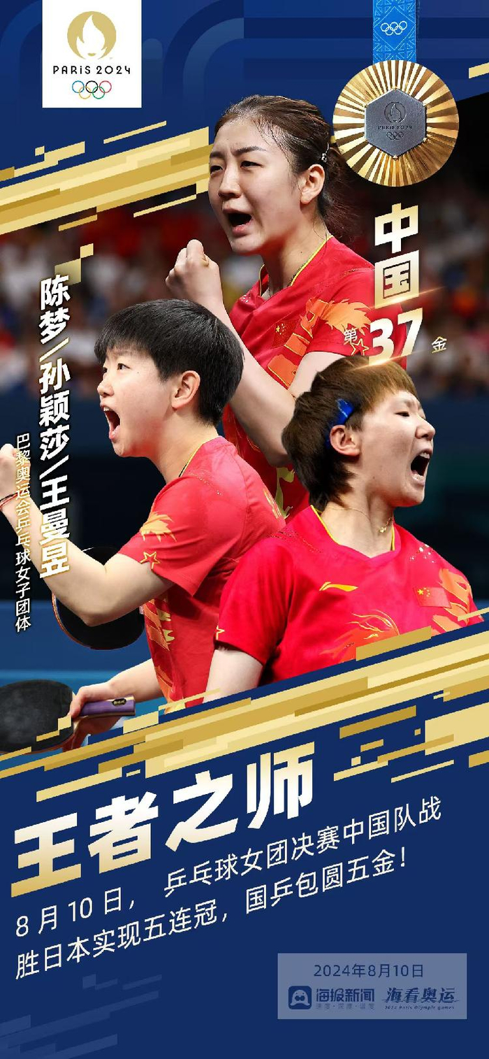 当地时间8月10日,巴黎奥运会乒乓球女子团体决赛在南巴黎竞技场4号馆进行。由孙颖莎、陈梦、王曼昱组成的中国队战胜由早田希娜、平野美宇和张本美和组成的日本队,夺得金牌。中国乒乓球队连续第五次获得奥运会女团冠军。中国队首次包揽奥运会乒乓球项目5枚金牌!