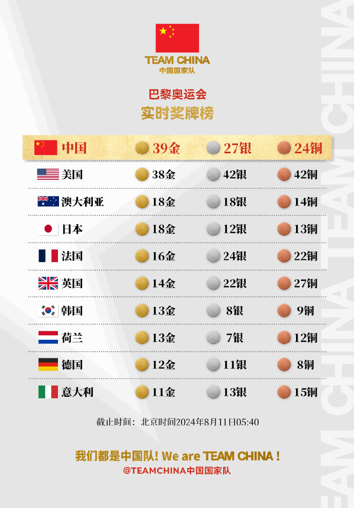 巴黎奥运会第十五个比赛日(8月10日)结束,共决出39枚金牌。其中6枚金牌、1枚铜牌被中国选手收入囊中。奥运赛程接近尾声,截至目前中国代表团共斩获39枚金牌、27枚银牌、24枚铜牌,暂列奖牌榜第1。