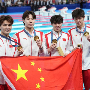 8月4日,巴黎奥运会男子4×100米混合泳接力金牌获得者徐嘉余、覃海洋、孙佳俊、潘展乐(从左至右)在颁奖仪式后合影。(图源:新华社)