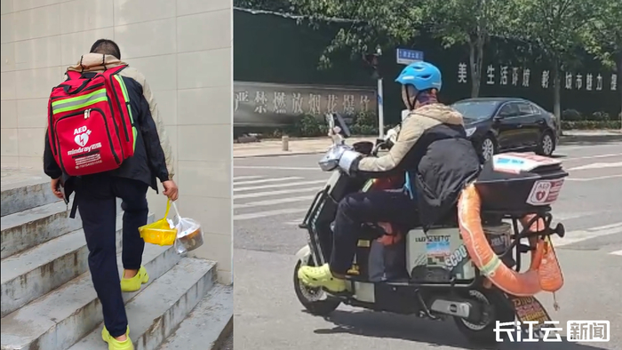 近来,武汉持续高温,在街头巷尾中随处可见外卖员忙碌的身影,而34岁的赵彬是其中特别的一位。烈日高悬,许多送餐的外卖员都巴不得穿得越少越凉快,可他除了那身早已被汗水湿透的衣服,背上还驮着一套AED(自动体外除颤器)装备。