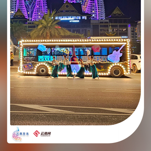 “欢迎来到西双版纳”“观光巴士”字样