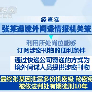 近期,有群众拨打12339国家安全机关举报受理电话,反映“某涉密刊物可能外泄”相关线索,国家安全机关经过缜密侦查,最终锁定犯罪嫌疑人张某。经查实,张某遭境外间谍情报机关策反后,利用所处岗位能够订阅涉密刊物的便利条件,通过快递公司寄递的方式为境外间谍人员提供涉密刊物。最终张某因泄露多份机密级、秘密级文件,被依法判处有期徒刑10年。