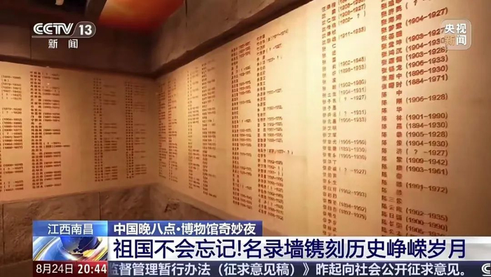 吸引游客们来到这里的,不仅仅是炫目的灯光秀,还有它的馆藏陈列以及背后的历史。在我身后的这面墙就是南昌起义的参加者名录墙,大理石墙面上刻满了革命先烈的名字,现在这个名录也在不断地增加。通过纪念馆工作人员的调查走访,今年又有8位起义军战士“归队”,南昌起义参加者名录增至1186人。一个个名字的背后是一段段感人的故事,一个个故事的背后体现的是伟大的革命精神。现在,纪念馆的工作人员也还在不断地走访发掘,让更多“隐姓埋名”的起义参加者们重新入列。