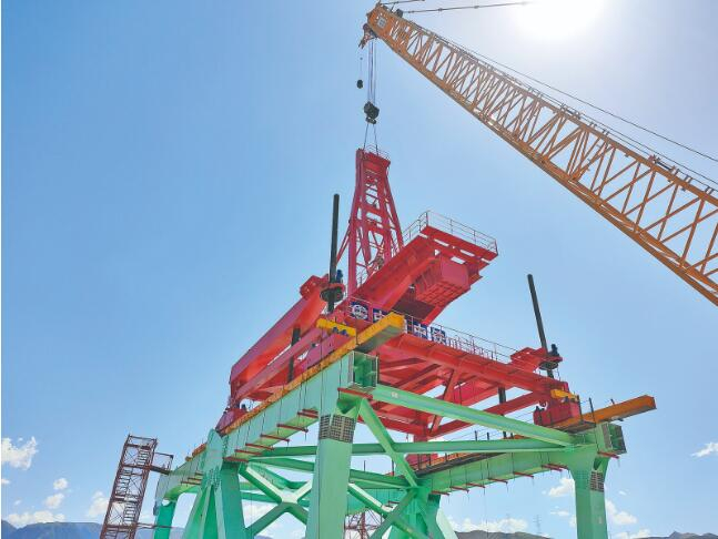 尖扎黄河特大桥的施工现场,这一跨,让这座桥成为目前世界上跨度最大的双线铁路连续钢桁拱桥。摄影:倪晓颖 董洁