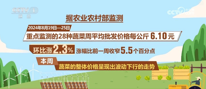 据农业农村部监测,2024年8月19日—25日,重点监测的28种蔬菜周平均批发价格每公斤6.10元,环比涨2.3%,涨幅比前一周收窄5.5个百分点。本周,蔬菜的整体价格呈现出波动下行的走势。