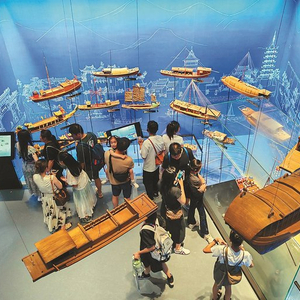 如何让高科技加持讲述运河故事?博物馆依托融媒体技术,制作多个沉浸式体验空间,让游客身临其境感受大运河畔的美好生活。“沙飞船”展区如今是中运博最热门的体验场所之一,站在甲板上,游客可阅览360度环幕上呈现的古时大运河繁忙景象,可谓“船在河中走,人在画中游”。