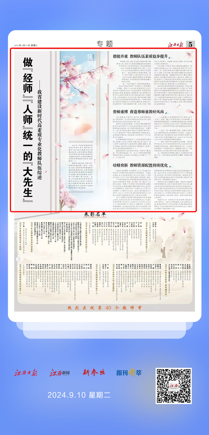 国将兴,必贵师而重傅。江西素有尊师重教的优良传统,每年教师节,全省各地各校都会开展形式多样的表彰庆祝活动,用心用情为教师欢庆这一专属节日。近年来,我省还通过“感动江西教育年度人物”、中小学“最美教师”和高校“最美辅导员”等推选活动,定期表彰师德高尚、扎根基层、在教育教学工作中业绩突出的教师。