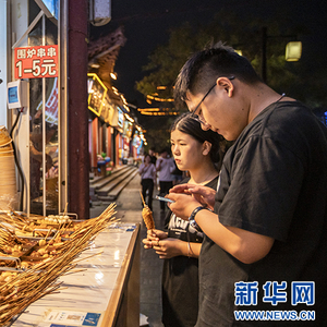 9月8日,河南省商丘市睢阳区商丘古城,游客在购买小吃。