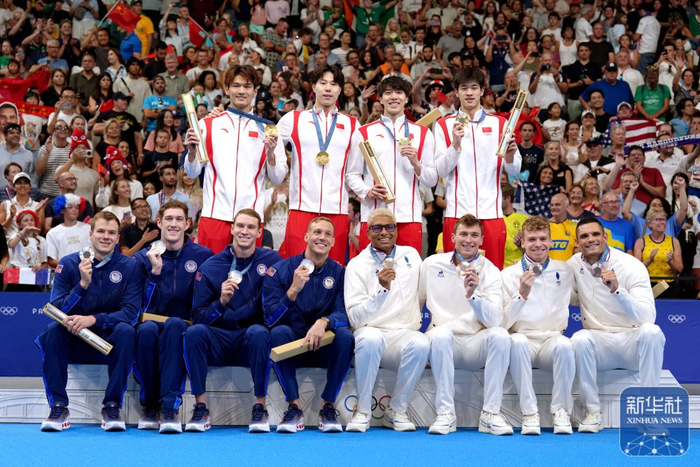 ↑2024年8月4日,冠军中国队选手徐嘉余、覃海洋、孙佳俊、潘展乐(上,从左至右)与亚军美国队、季军法国队在巴黎奥运会游泳男子4x100米混合泳接力颁奖仪式上。中国队打破美国队对这一项目金牌长达40年的垄断。新华社记者 杜宇 摄