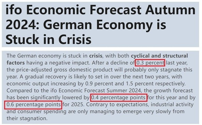 △德国伊弗经济研究所发布的秋季经济预测报告显示,德国经济继去年萎缩0.3%后仍将面临危机。该研究所对德国经济今年的增长预期已在夏季预测基础上下调0.4个百分点,明年增长预期更是下调了0.6个百分点。