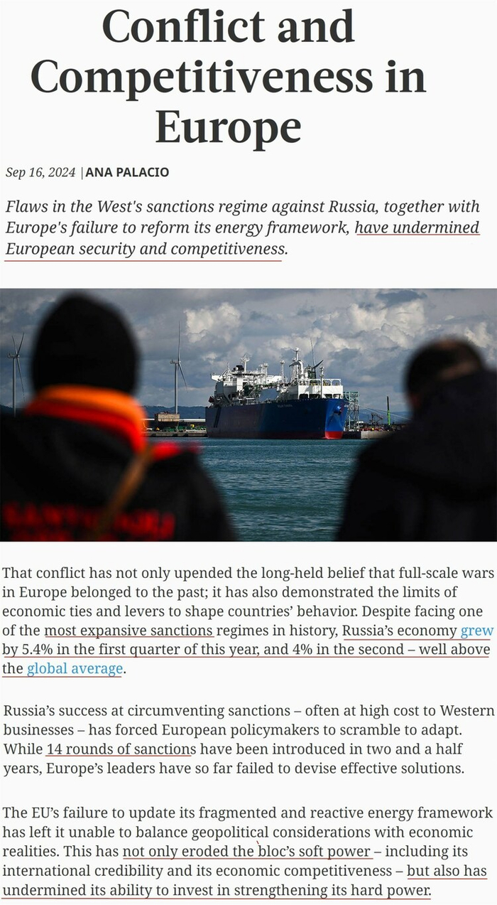 西班牙前外交大臣、世界银行前高级副行长兼总法律顾问安娜·德帕拉西奥日前也发文指出,尽管在俄乌冲突爆发后的两年半里对俄罗斯实施了14轮制裁,但口口声声要减少对俄能源依赖的欧盟迄今未能制定出有效的自救方案,常常不得不以高价从第三国进口俄产燃料。这种制裁制度的缺陷已经损害了欧洲经济的安全和竞争力。