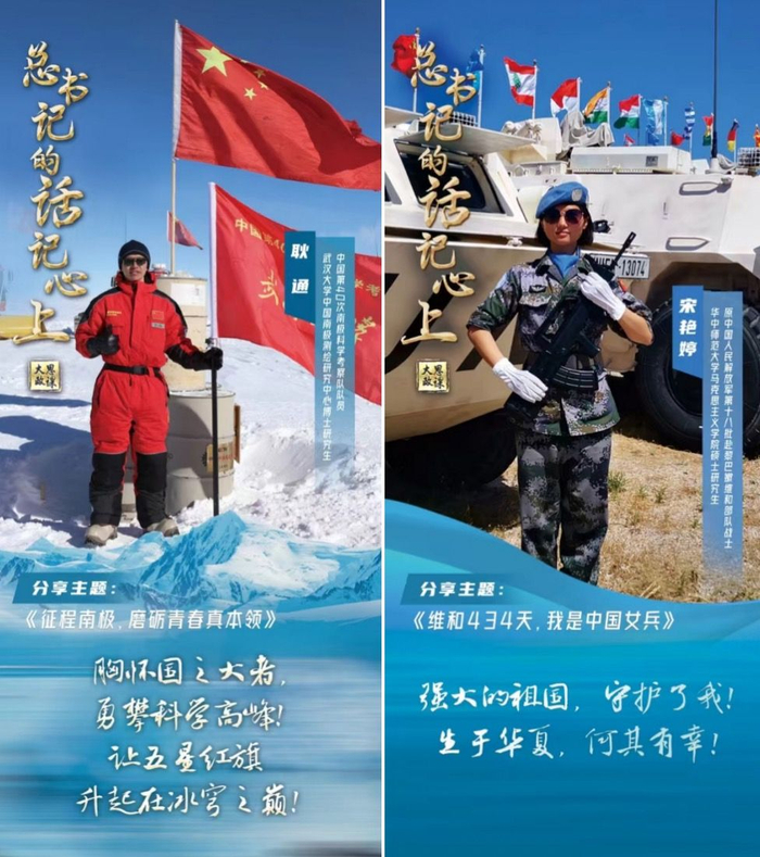 “当代中国青年是与新时代同向同行、共同前进的一代,生逢盛世,肩负重任。”时代为青年创造着舞台,青年在时代中实现着自我。武汉大学中国南极测绘研究中心博士研究生耿通,参与了中国第40次南极科学考察。他登顶南极内陆冰盖最高点,亲手把五星红旗升起在昆仑站。历时62天时间里,他随队深入冰盖1200余公里,登顶海拔4093m的南极最高点,开展实地考察,圆满完成10余项科研任务!华中师范大学马克思主义学院的青年学子宋艳婷,立志要把“最灿烂的年华和一腔热血奉献给军营”。她曾作为第十八批赴黎巴嫩维和建筑工兵分队的一员,奔赴黎巴嫩执行维和任务434天。戴上蓝盔,她和战友们清理边境线上的雷场,修建完善防卫工程,开展人道主义救援任务,完成联合国赋予的工作任务;同时,开设汉语学习班,传播文明友谊,用实际行动,向世界各国诠释中国维和部队是一支和平之师、文明之师、友好之师……把青春献给祖国,践行中国军人守卫世界和平的使命与担当。宋艳婷说:“而我,必将以奋进之姿,向明天,向未来!”