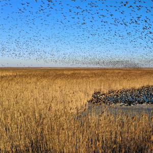 张希涛告诉记者:“首先来的一般是鹤类和雁鸭类。丹顶鹤、蓑羽鹤、白头鹤、白枕鹤、沙丘鹤等等这一系列鹤都要来。其次是雁鸭类的,像野鸭在我们这里有接近30种:斑嘴鸭、绿头鸭、秋沙鸭、白头鸭、赤麻鸭等等。鸟浪最厉害的时候能达到一两公里,非常壮观。”