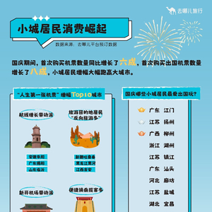小城居民消费实力“爆表”,更多的三线及以下市县居民开启了第一次飞行和出国旅行。去哪儿平台上,国庆期间,600余个三线及以下城市和县城居民首次乘坐飞机,首次购买机票量同比增逾五成;三线及以下城市居民出境游订单量同比增长近3倍,远超一线城市。小城作为旅游目的地,也正变得更具吸引力,酒店预订增幅最高的Top10目的地都是小城和县城,县域高星酒店火爆,预订增幅达到五成。
