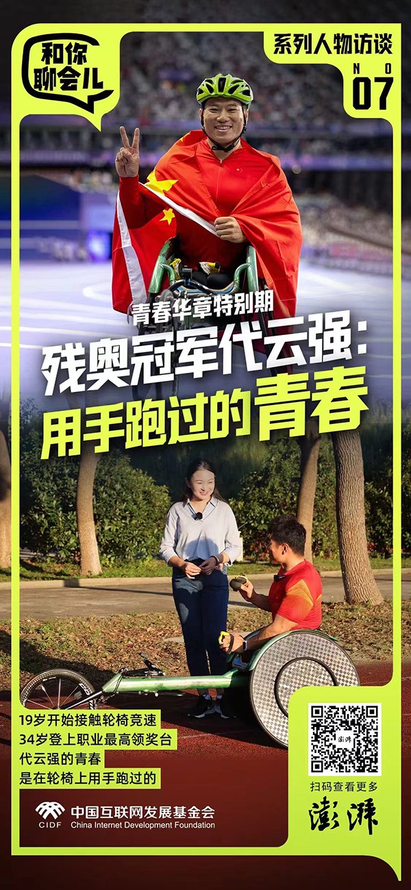 用速度征服世界,巴黎奥运会、残奥会的运动员们,都在世界舞台上展现着中国青年的竞技素养和大国自信。9月,在澎湃新闻“和你聊会儿”青春华章特别篇中,2024年巴黎残奥会田径冠军代云强讲述了自己的故事。这位自小患先天性下肢畸形的运动员,用手推动轮椅进行竞速,“站”上了世界最高领奖台。