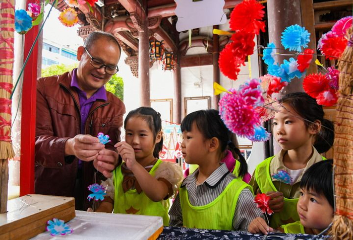 10月4日,在浙江省金华府城隍庙,小朋友观看手工艺人制作纸花。
